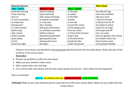 What is a fronted adverbial? - FREE Mat and Worksheets from themumeducates.com These adverb phrases of time are modifying the verb of the sentences by talking about the time of the action. Which word cannot go in the space? As can be seen, they are made up of one or more words and indicate time, doubt and quantity (like an adverb). In grammar, an adverbial (abbreviated. She arrived home three hours later. Adverbial phrases can also function as infinitive phrases by incorporating infinitive verbs when they for example, if you were to say i went into town to visit my friend, the adverbial phrase to visit my together, they function as an adverbial phrase to offer greater detail about the specific time period. The examples are italicized for easy identification. An adverb or adverbial phrase is one or more words that change the verb in a sentence.